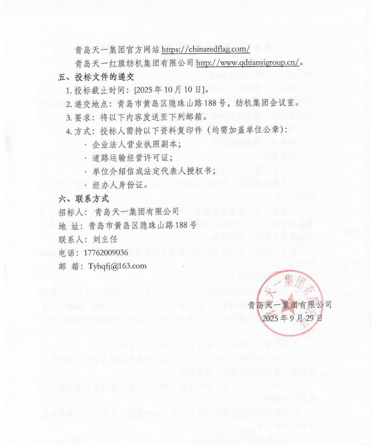 青島天一集團關于紡機集團公司物流運輸業務公開招標公告