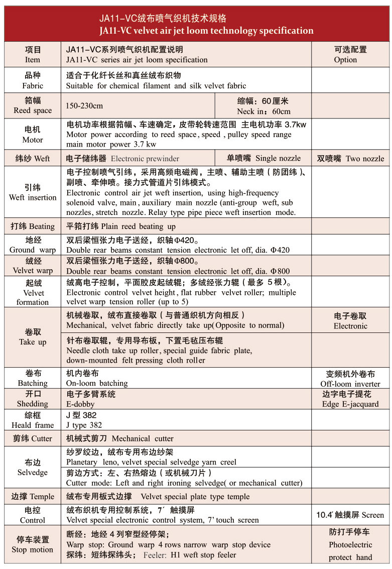 JA11-VC絨布專用高檔噴氣織機是青島天一集團紅旗紡織機械有限公司經過多年研發專用于絨布織造的一種特種噴氣織機,經過用戶使用,在開機效率、運轉速度、織造質量、智能操作等方面都達到較為理想的效果,是絨布織造行業更新換代的理想產品。